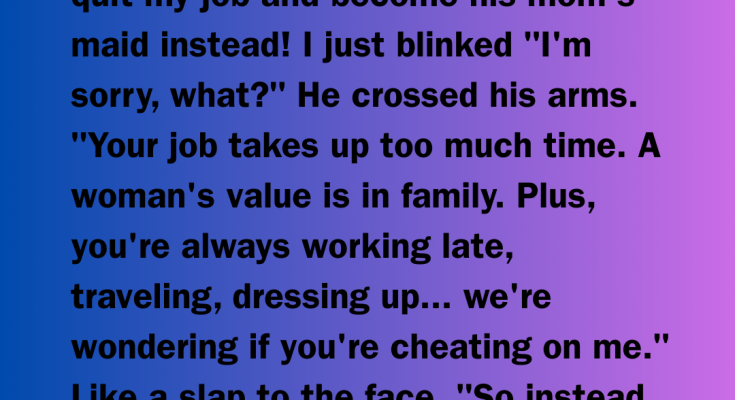 Ethan walked in, took a deep breath and said, “We need to talk… Mom and I decided you should quit your job.” I stared at him in disbelief. He explained that “family” was more important than my work, and that I should stay home to take care of things around the house — for both of them.