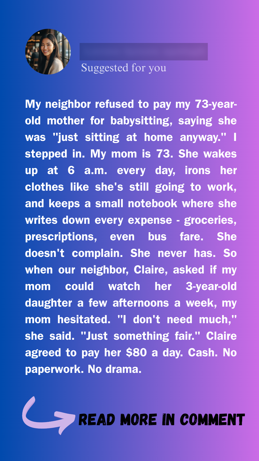 My Neighbor Refused to Pay My 73-Year-Old Mom for Babysitting — Saying She Was “Home All Day Anyway.” So I Stepped In