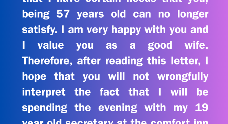 You will surely understand that I have certain needs that you, being 57 years old, can no longer satisfy. I am very happy with you and value you as a good wife. Therefore, after reading this letter, I hope you will not wrongfully interpret the fact that I will be spending the evening with my 19-year-old secretary at the Comfort Inn Hotel.