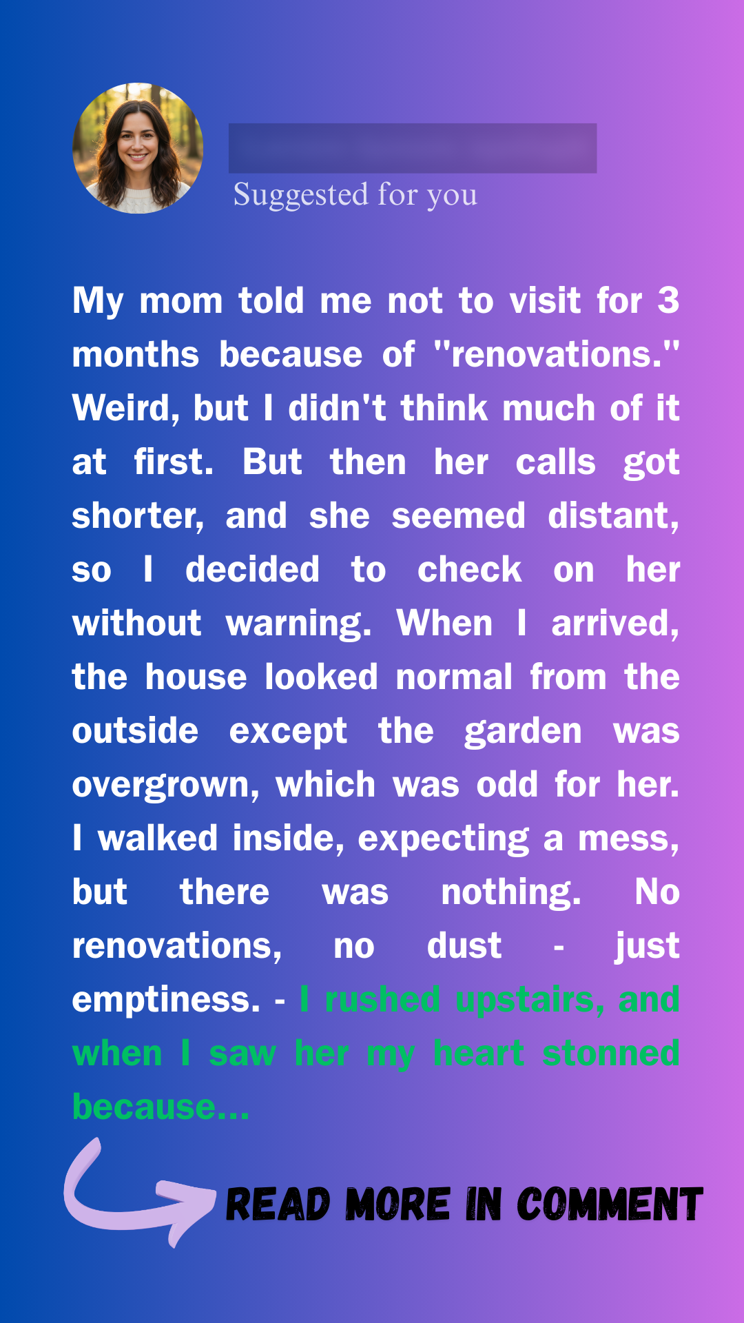 For three months, my mom had insisted her home was being renovated, that I shouldn’t come over — but something in her voice felt… off. Finally, I couldn’t ignore the uneasy feeling in my gut anymore and decided to surprise her. What I discovered wasn’t what I expected.