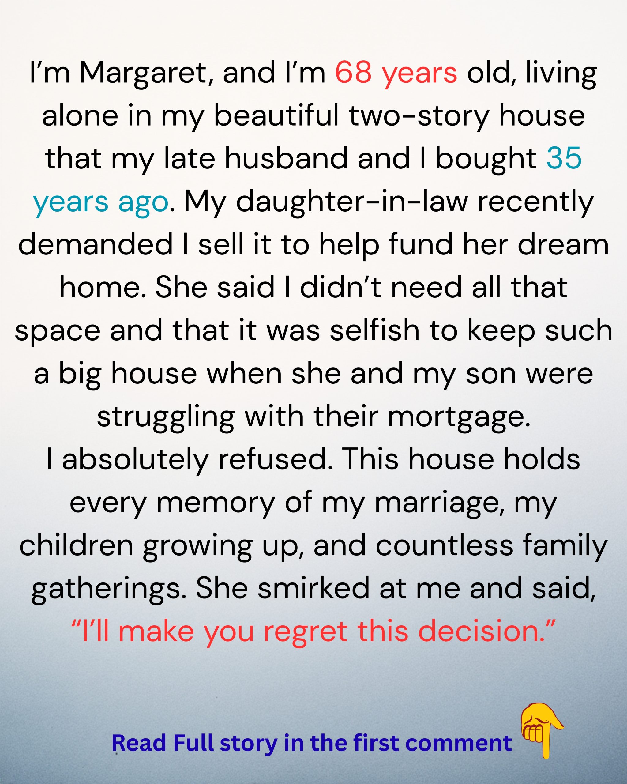 There is room for compromise without erasure. There is room for generosity that doesn’t demand the disappearance of someone else’s history. I will help them, yes—I love my son and I want him to have a home. But I will not sell the only house that contains the thread of my life just so someone else’s dream has a faster start.