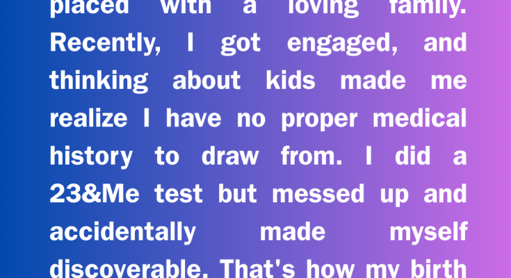 “I get that,” I told her, “but what if there’s something in my DNA we don’t know about?” I was adopted as a baby, found abandoned in an alley. It was a painful truth, but my adoptive parents raised me with love and honesty, and I knew everything about my past — or so I thought.