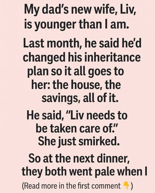 By the time dessert arrived, the three of us were talking like actual humans instead of characters playing assigned roles. Dad admitted he’d been terrified of losing another relationship and had overcorrected. Liv admitted she’d been insecure about being seen as “the young wife” and clung to financial security as proof of her place.