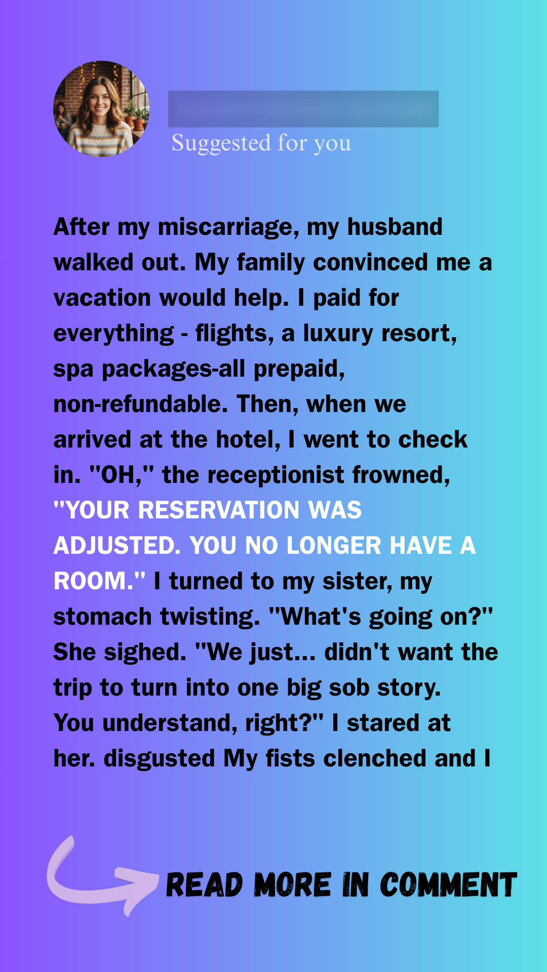 At the desk, the receptionist told me my reservation had changed. My penthouse suite? Gone. My room? Canceled. My heart sank. I looked at my family — and saw no shock, only subtle guilt.