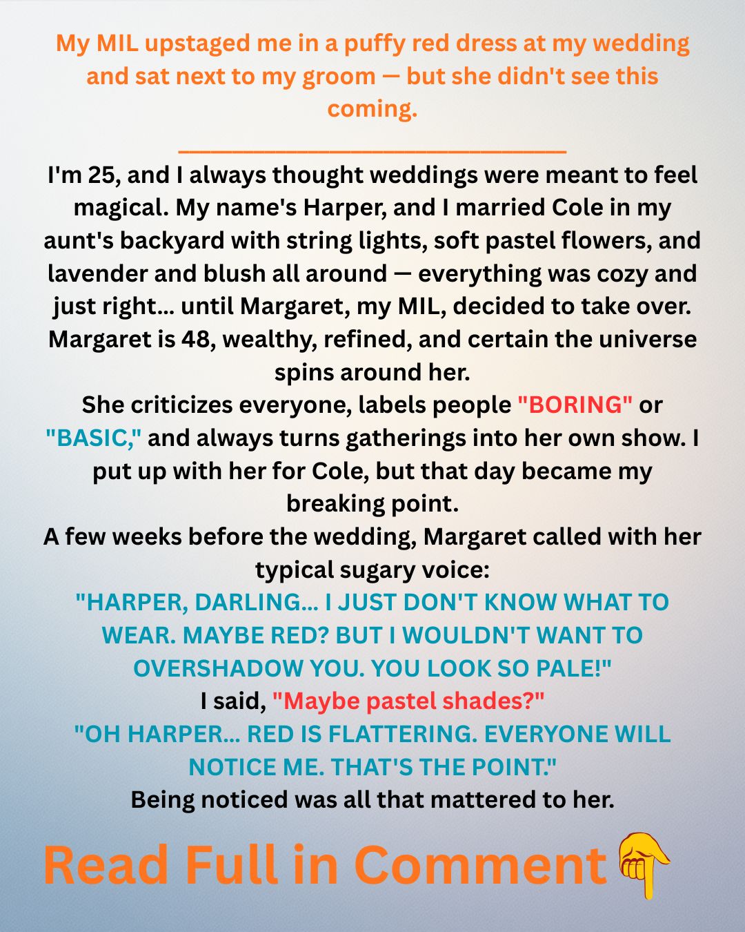 She smiled with all teeth. “Of course, dear. We don’t want people thinking I’m the bride, do we?”