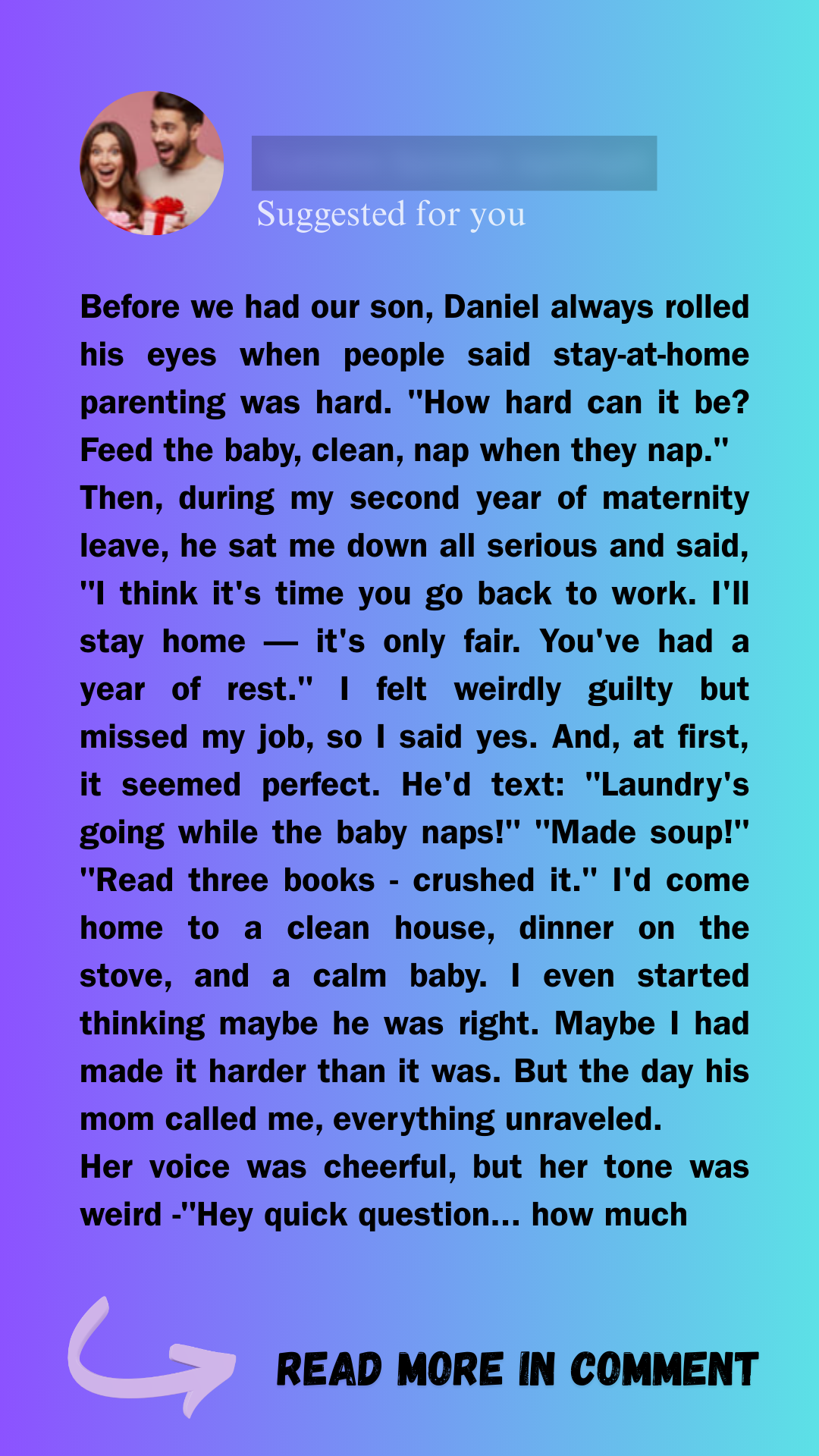 When my husband, Daniel, suggested he stay home with our baby Cody so I could go back to work, I felt relieved – finally a clean house, warm meals, and a partner who seemed ready to share parenting duties. Little did I know, the perfect picture he painted was about to crack wide open… with one phone call from his mom.