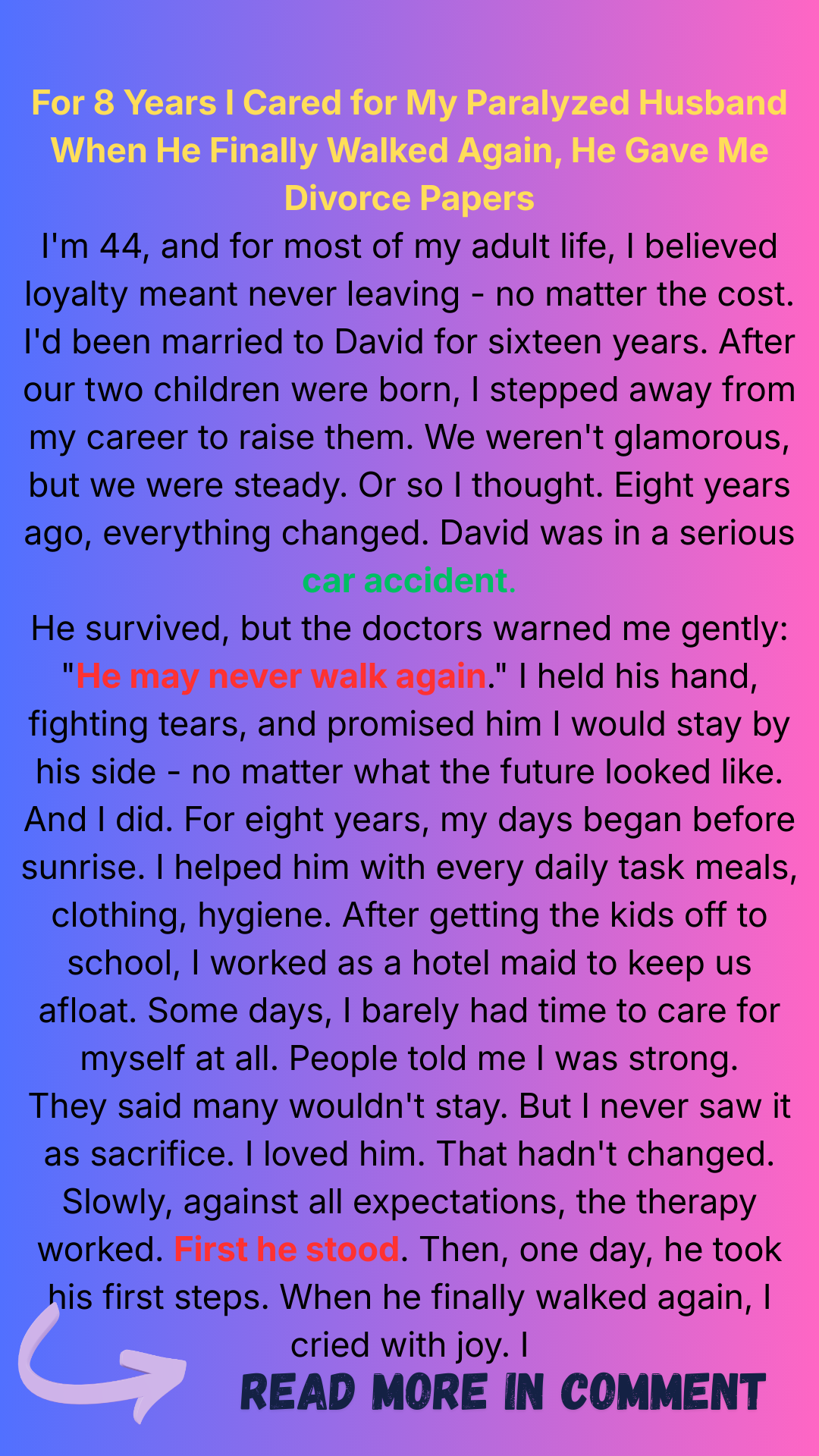 At that point, I felt like the floor had dropped out from under me. David, my strong, ambitious husband, would never walk again? It seemed impossible.