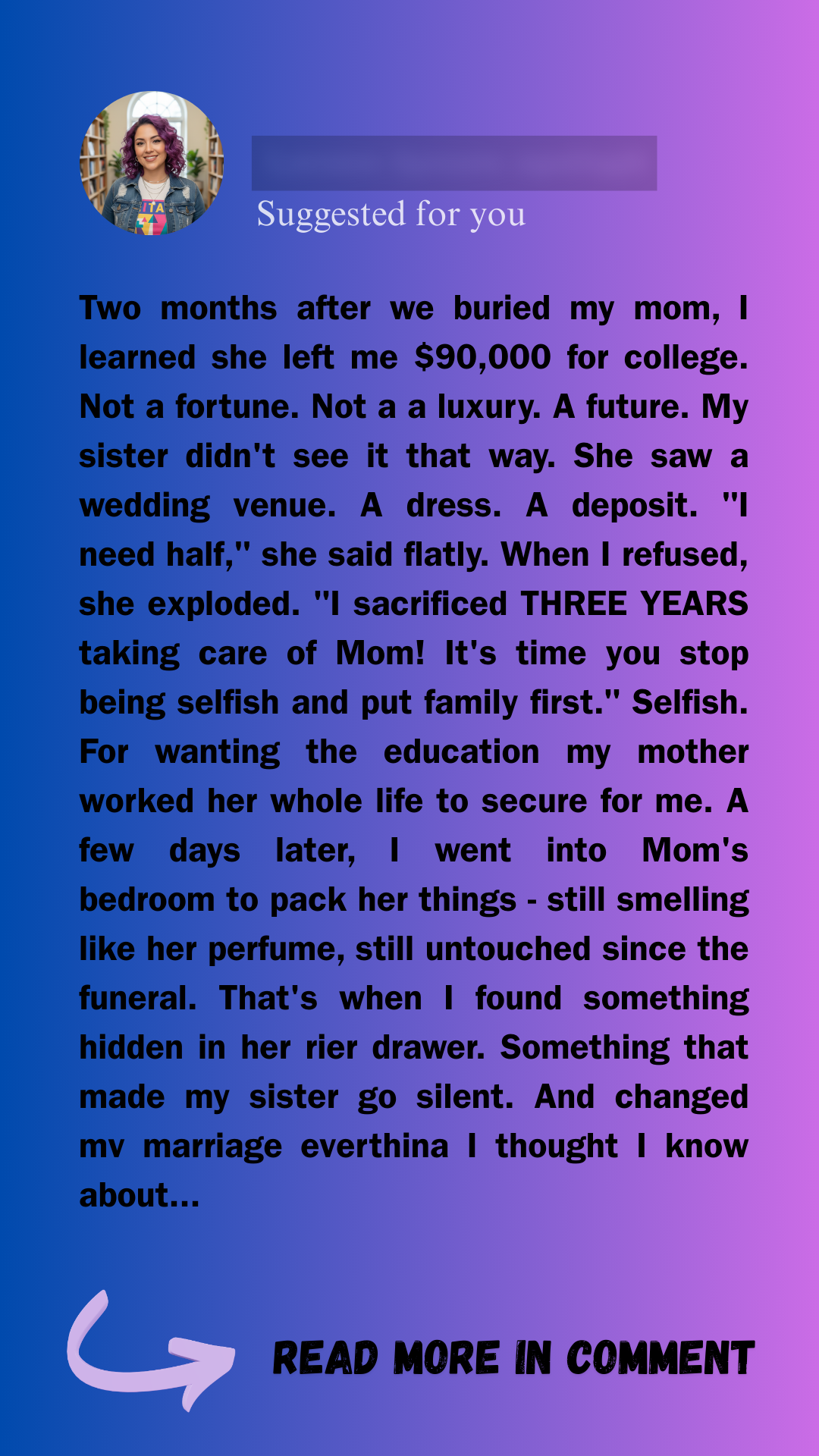 But my sister didn’t see that. Three days later, she showed up at my apartment and demanded half of the money — not for education, but for her wedding. She reminded me of all the time she’d spent caring for Mom: appointments, meals, medications. In her eyes, that sacrifice meant she was owed half.
