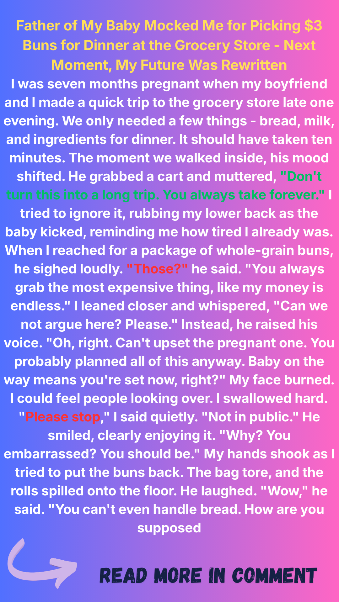 He raised his voice loudly enough for people in line to hear. “Why not? Embarrassed? You should be. Probably got pregnant on purpose. A baby means you’re set for life, huh?!”