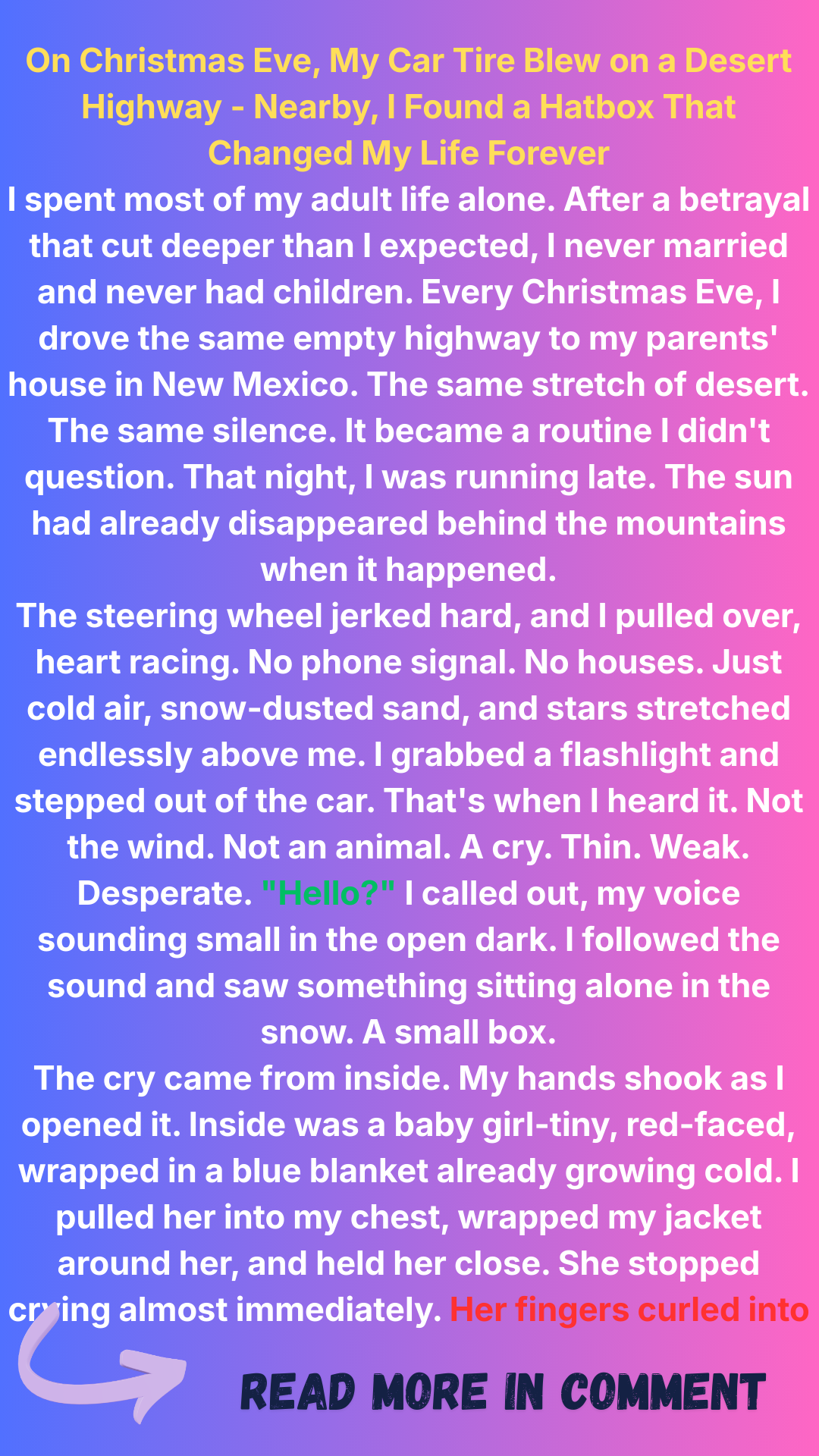 I was driving alone on Christmas Eve when my tire blew on a deserted New Mexico highway. A cry in the darkness led me to a newborn baby in a hatbox. I held her close to warm her and lost my heart to her right there. I raised her as my daughter, but eight years later, someone came to take her back.