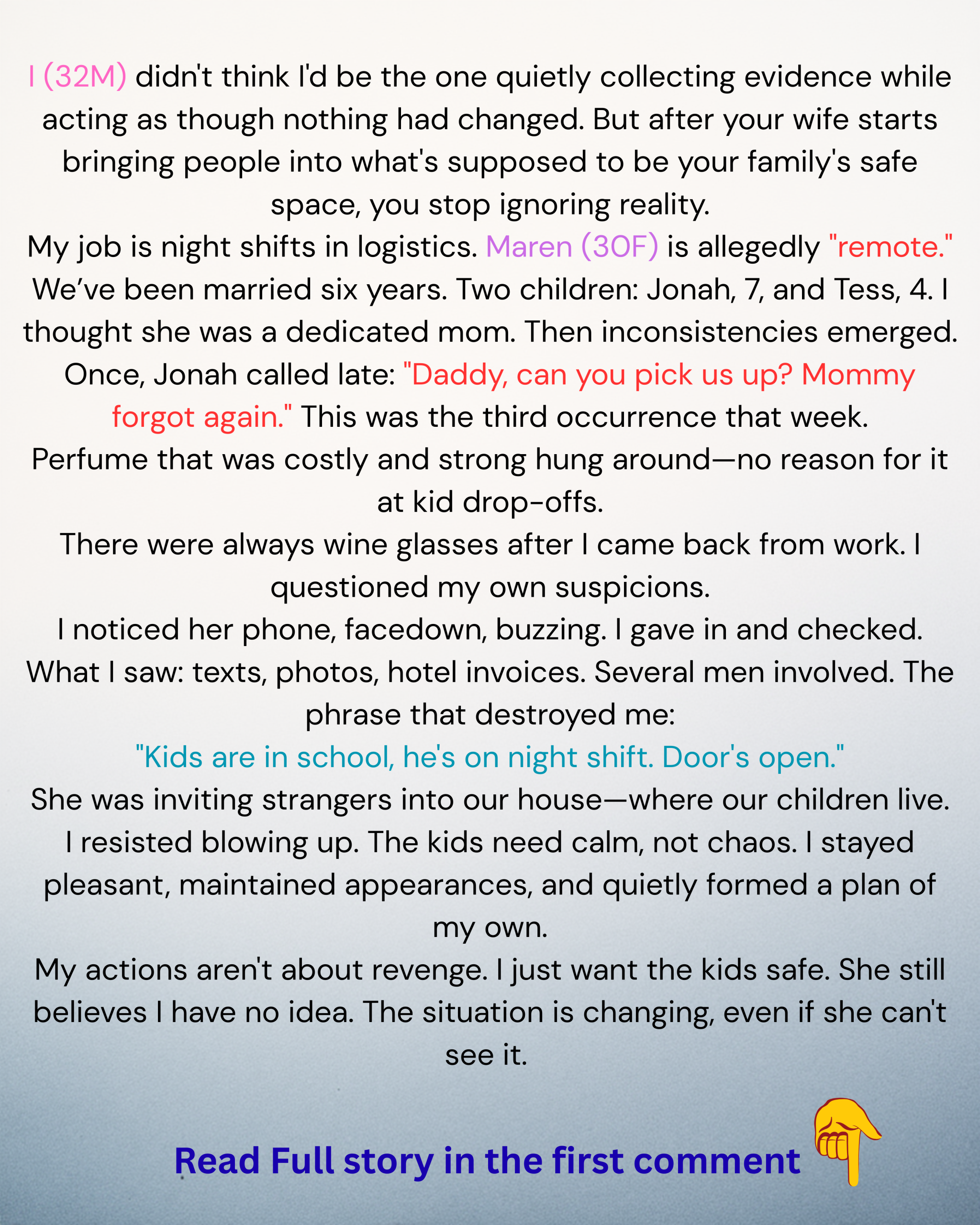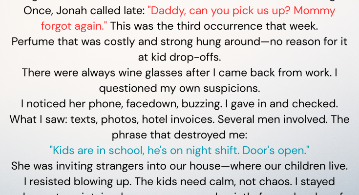 But the signs kept piling up. Missed school pickups. Unexplained charges on our joint account. Wine glasses in the sink when I hadn’t been home. I stopped asking questions and started watching.