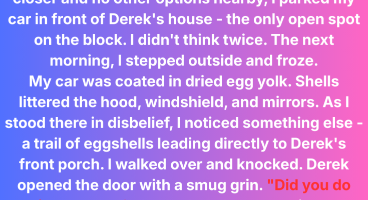 I blinked at it, frozen. For a second, I honestly thought I might still be dreaming. But then my eyes followed the trail — bits of broken eggshells scattered like breadcrumbs — leading directly from Derek’s driveway.