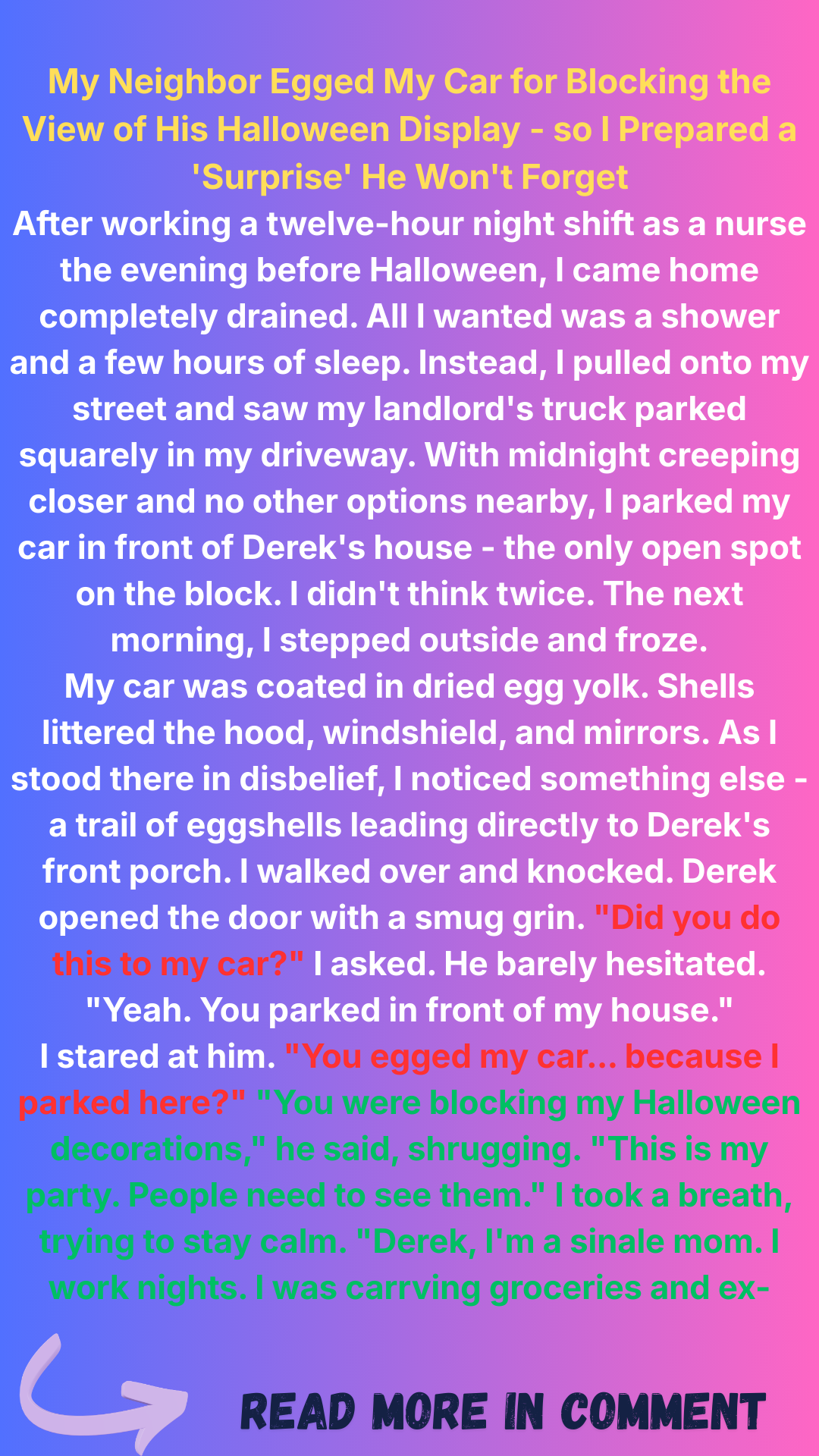 When a single mom finds her car vandalized days before Halloween, she’s stunned to discover her festive neighbor is behind it. But instead of retaliating, she chooses a smarter path — one lined with receipts, quiet strength, and a little bit of caramel.