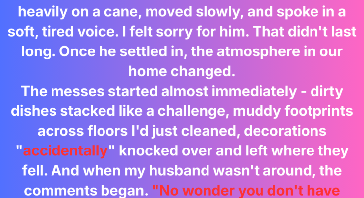 My husband opened the door before I could even stand up from the couch. His father was on the porch, leaning heavily on a cane, his shoulders slumped forward as if the weight of his body had suddenly become too much to carry.