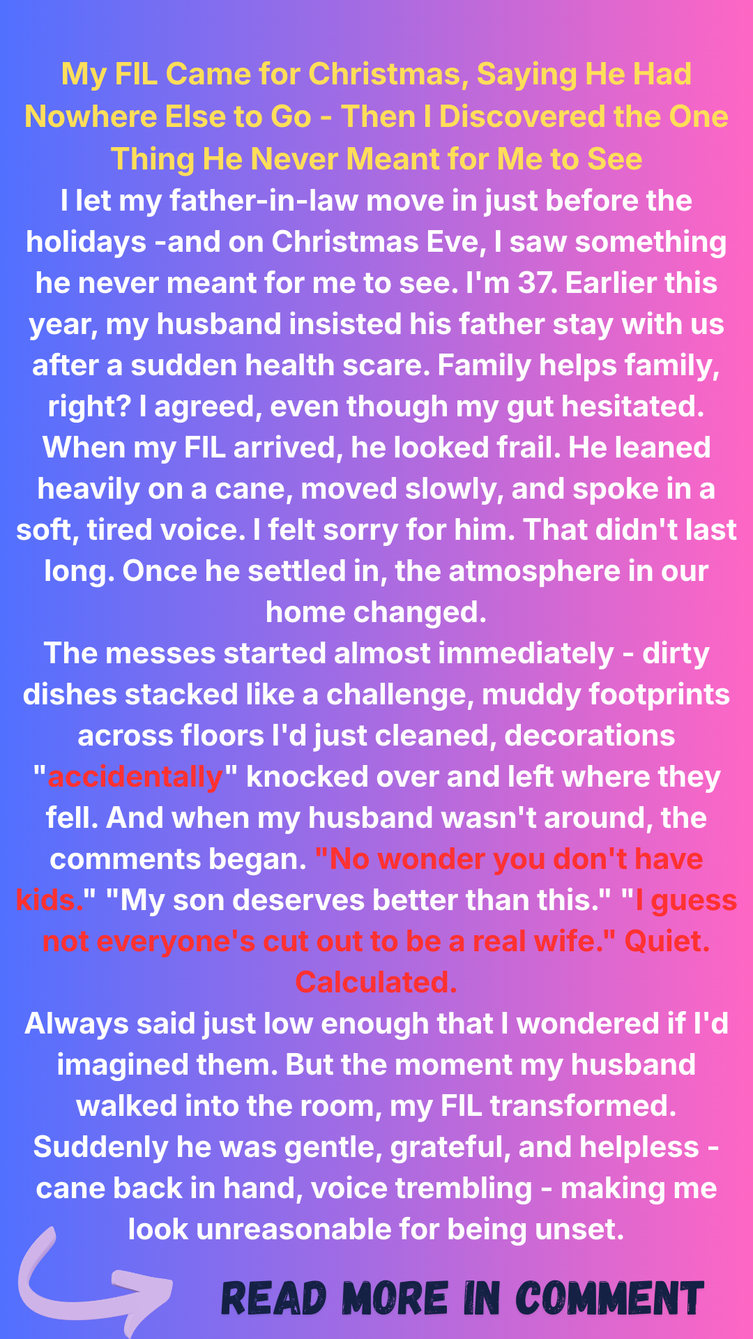 When Claire’s father-in-law arrives unannounced for Christmas, he brings more than just a cane and a fragile smile. As his charm begins to crack, Claire uncovers a bitter truth hiding beneath the holiday lights — and she’ll have to decide what peace really costs, and who’s worth keeping around.