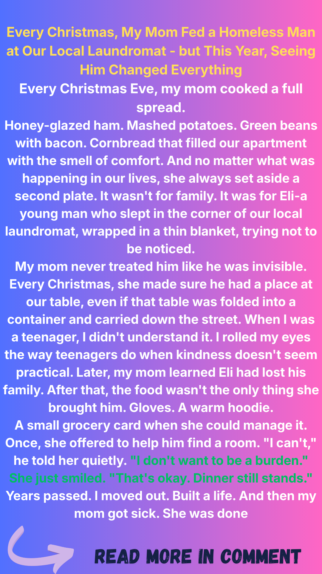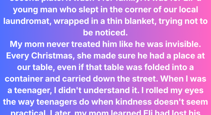 My mom spent years bringing Christmas dinner to a homeless man at the local laundromat. This year, she’s gone… cancer. So I went alone, carrying her tradition. But when I saw the guy, something felt off. And nothing had prepared me for the secret my mom had kept from me all along.