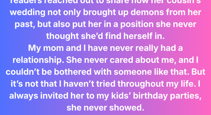 Weddings have a way of bringing the worst out in people. Family struggles can come to the surface and relationships could be destroyed. One of our readers reached out to share how her cousin’s wedding not only brought up demons from her past, but also put her in a position she never thought she’d find herself in.