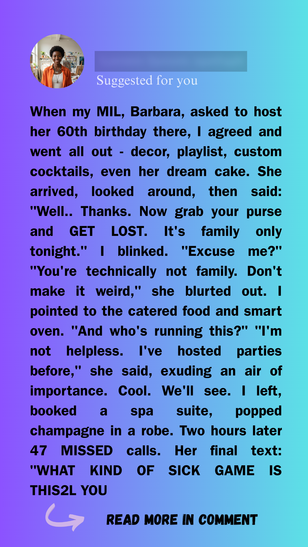 Though he resisted, the pressure made him give in, and I snapped — leaving the party in tears. At home, Bill confronted me for leaving without a word, but when I asked why he went along with it, he said he didn’t want to upset his mom on her birthday. That only made the betrayal sting more.