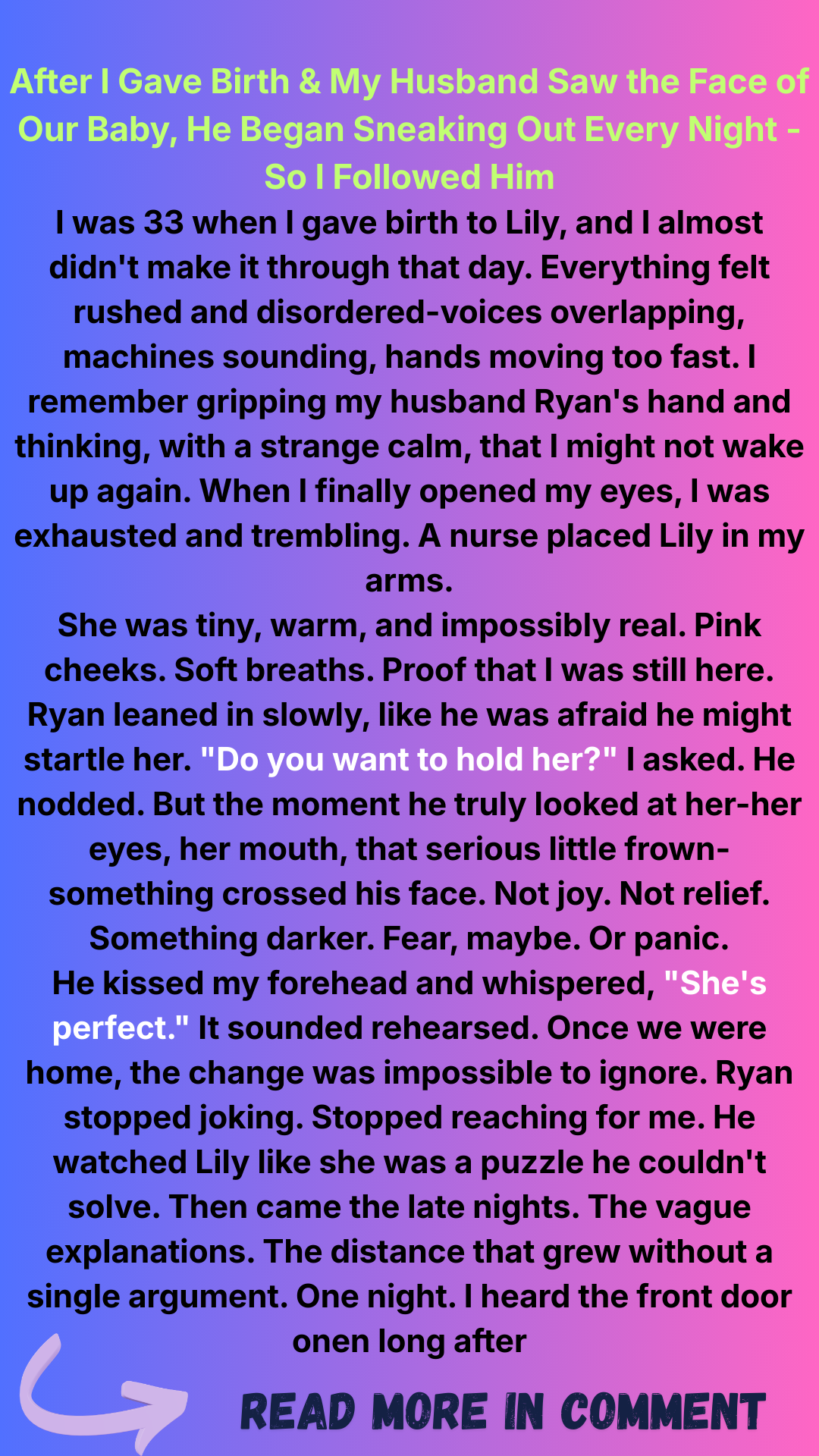 I sank down below the window, my own tears flowing freely now. This wasn’t about another woman. This wasn’t about him not loving us. This was about a man so traumatized by almost losing his wife that he couldn’t bear to embrace the joy of his new daughter.
