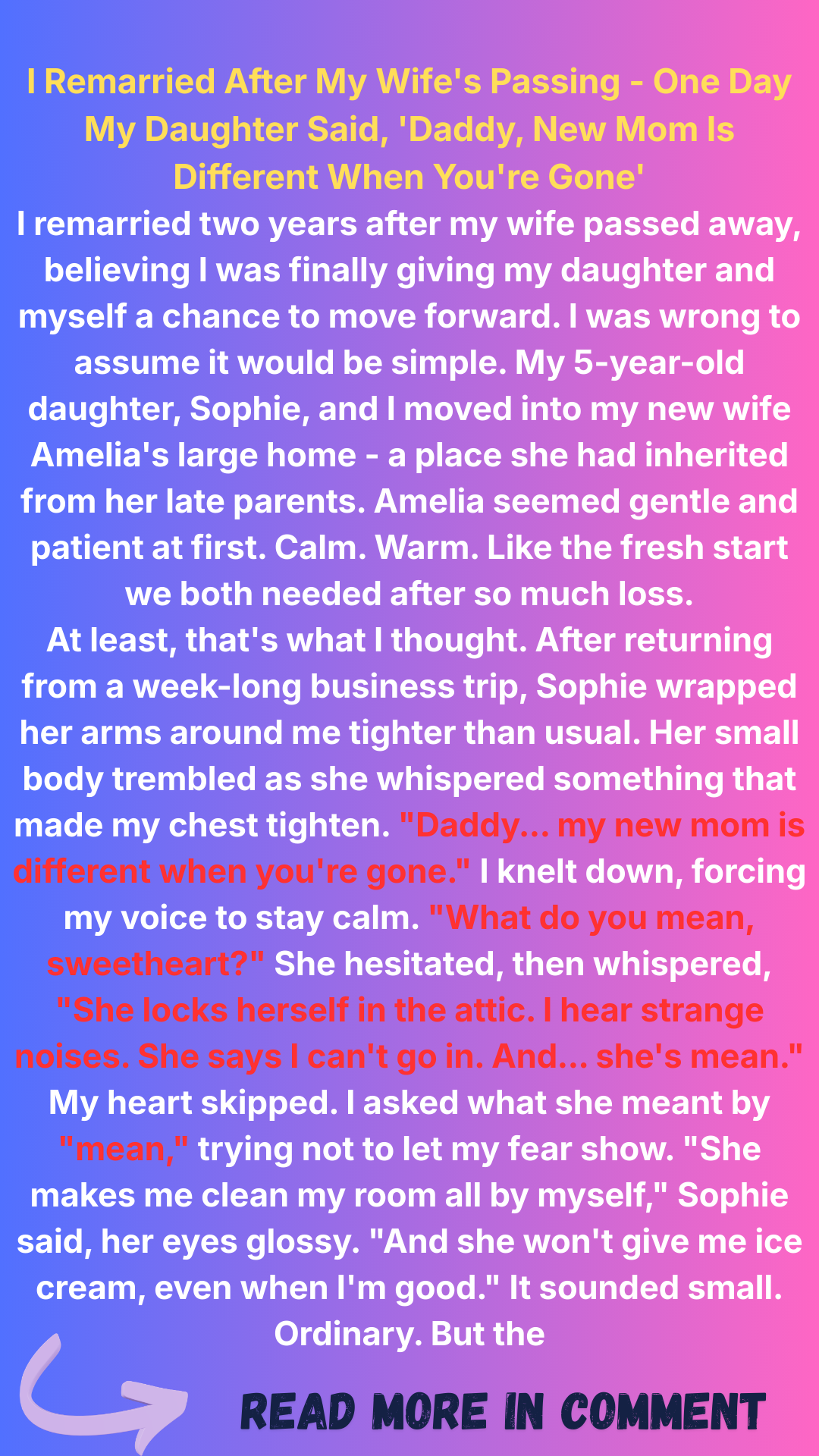 Two years after my wife’s passing, I remarried, hoping to rebuild my family. But when my 5-year-old daughter whispered, “Daddy, new mom is different when you’re gone,” I was stunned. Strange noises from a locked attic, strict rules, and Sophie’s fear spark a chilling mystery I can’t ignore.