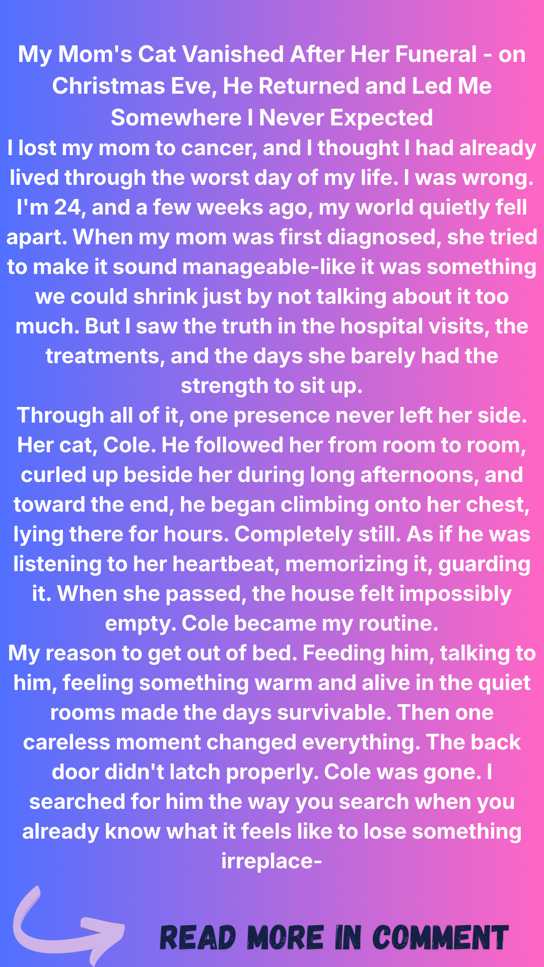 My mom died from cancer a few weeks ago, and her black cat, Cole, was the only thing holding me together. When he disappeared after her funeral, I thought I’d lost the last piece of my mother. On Christmas Eve, Cole came back with something in his mouth, and where he led me next left me in tears.