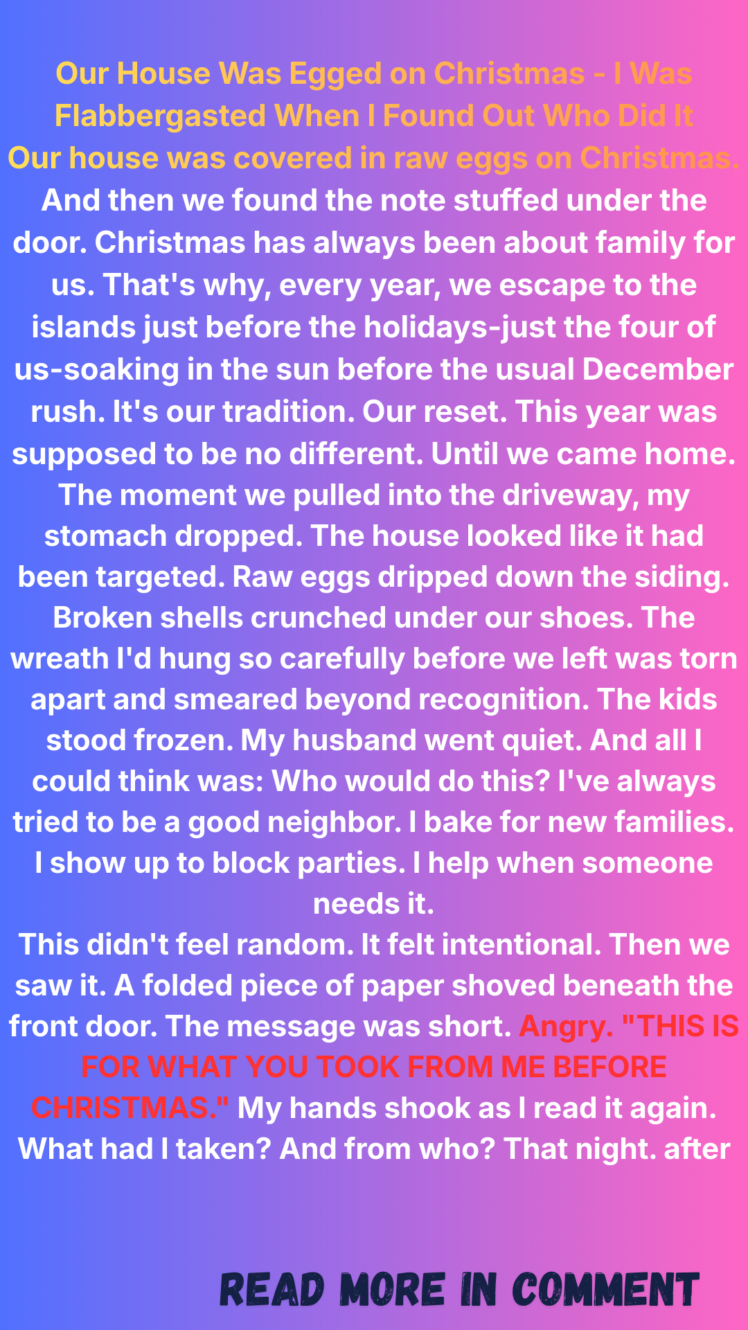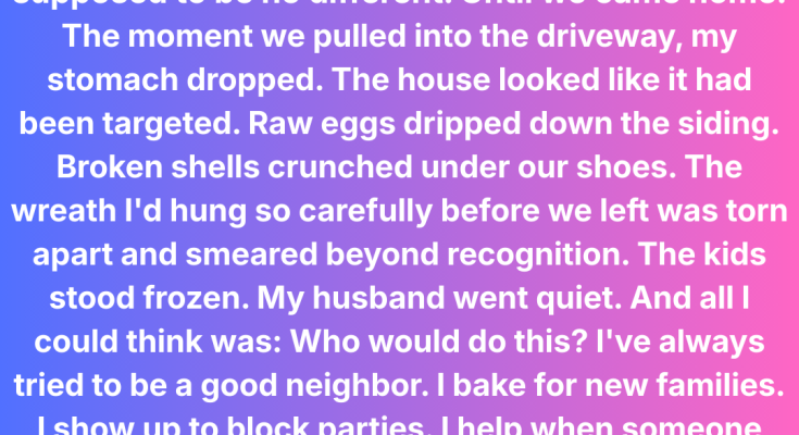 Raw eggs dripped from the walls in sticky streams, the porch was littered with broken shells, and even the holiday wreath I’d lovingly crafted was a splattered, smelly mess.