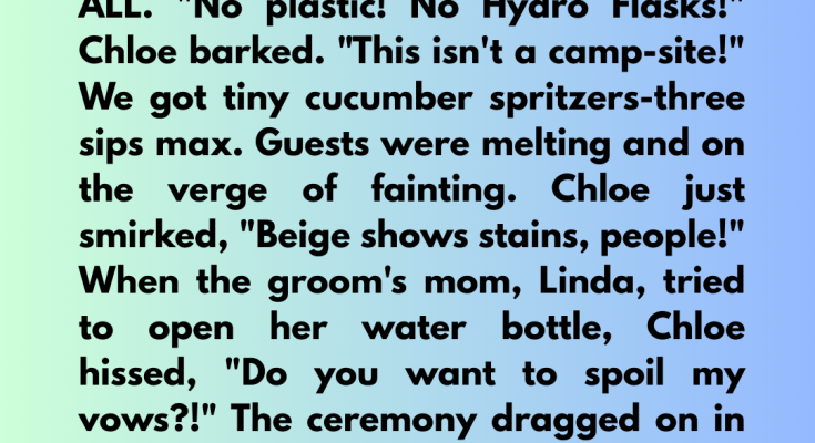 “No plastic bottles, no thermoses, no Hydro Flasks, and no colorful drinks,” she announced loudly. “This is a sophisticated wedding ceremony, not a campsite or a sports event.”