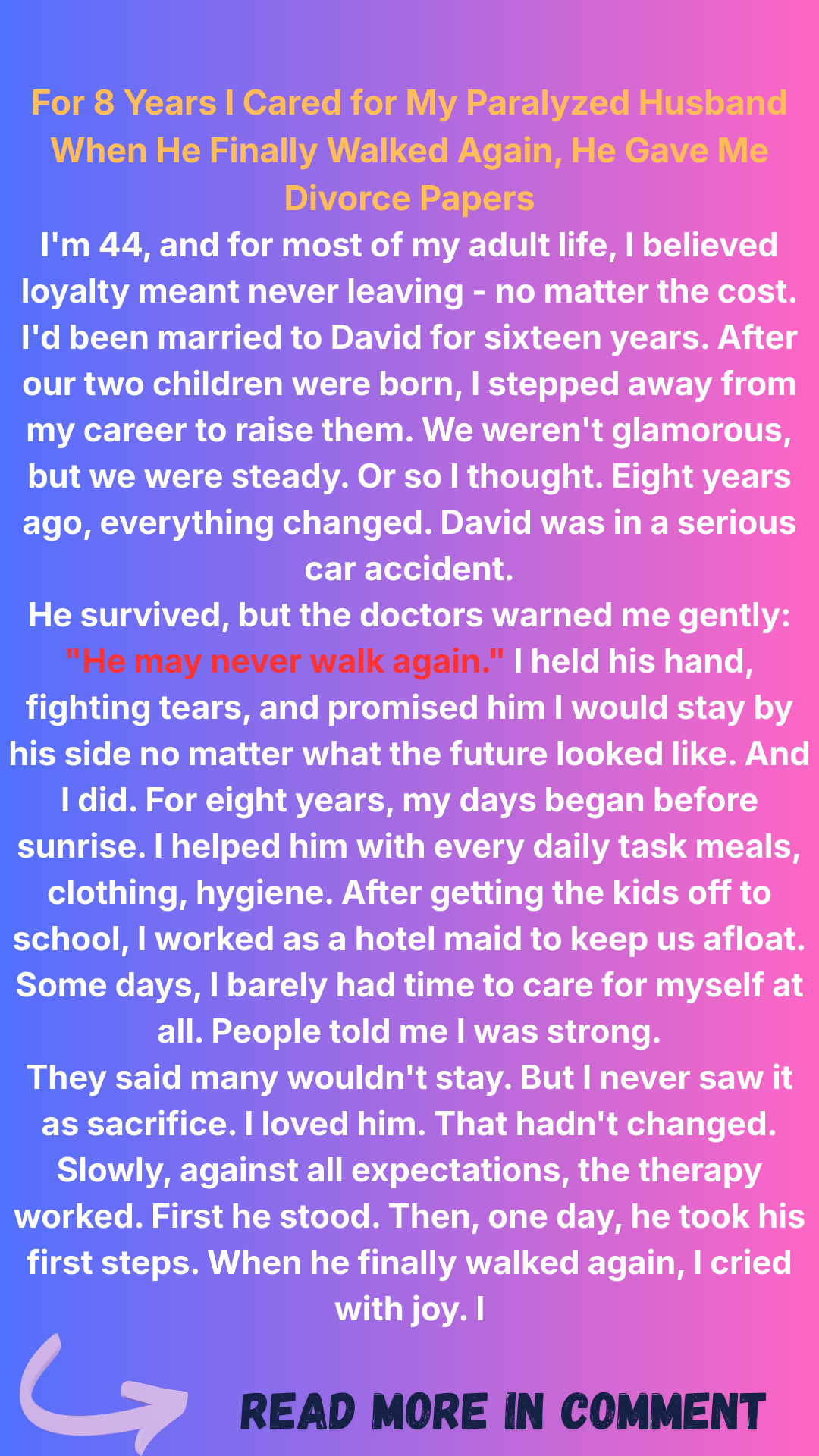 At that point, I felt like the floor had dropped out from under me. David, my strong, ambitious husband, would never walk again? It seemed impossible.