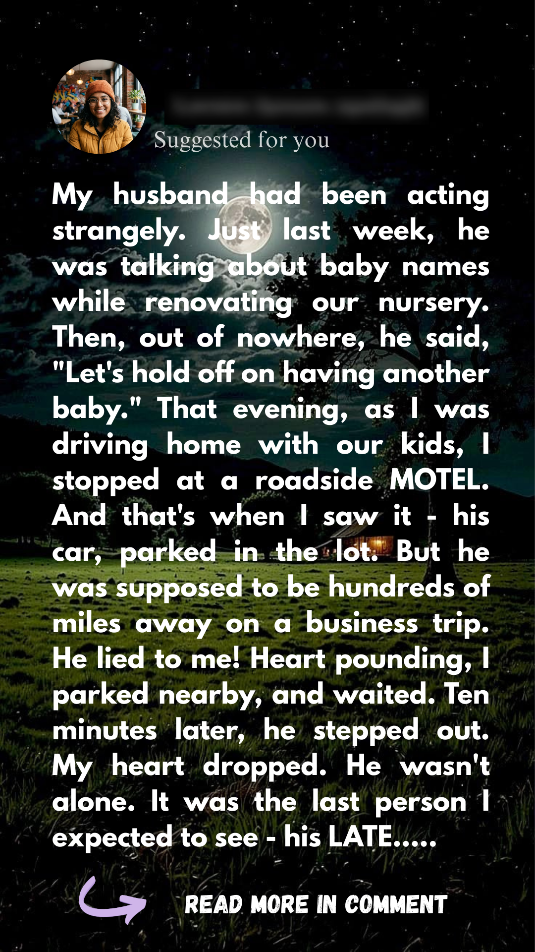 “Why is your car here?” I demanded. “Why are you lying to me? And why are you meeting her in a motel?”