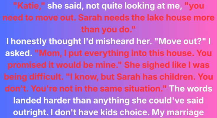 “Katie,” Mom said softly, her hands folded in front of her like she was delivering bad news to a stranger. She couldn’t even look at me. “You need to move out. Sarah needs the lake house more than you do.”