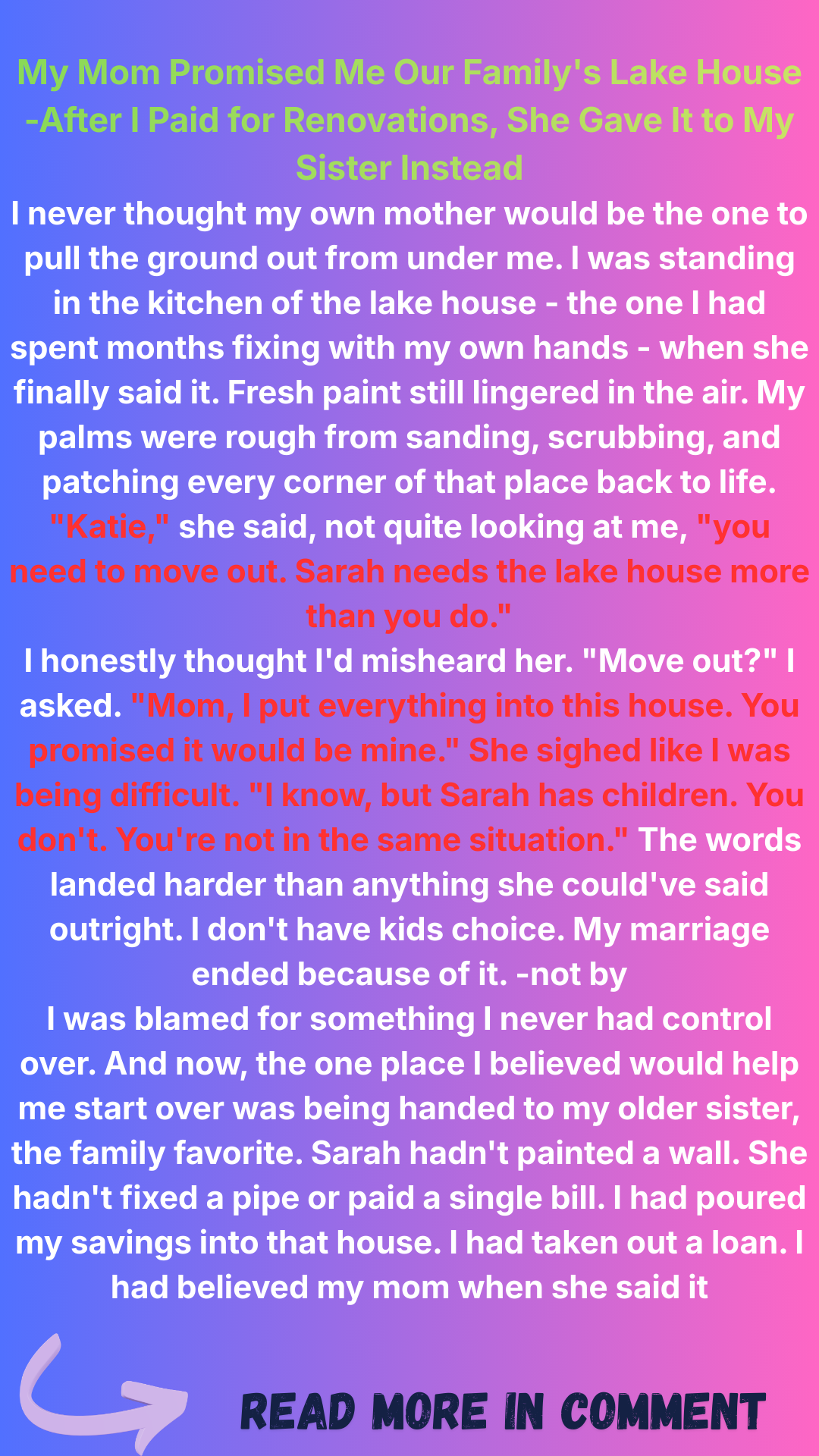 Katie’s mom PROMISED the family’s lake house would be hers one day. When she handed over the keys, Katie spent a year fixing the place, pouring her life savings into every detail. Months later, when she finally saw her dream come to life, her mom JUST RIPPED IT AWAY and gave it to her sister.