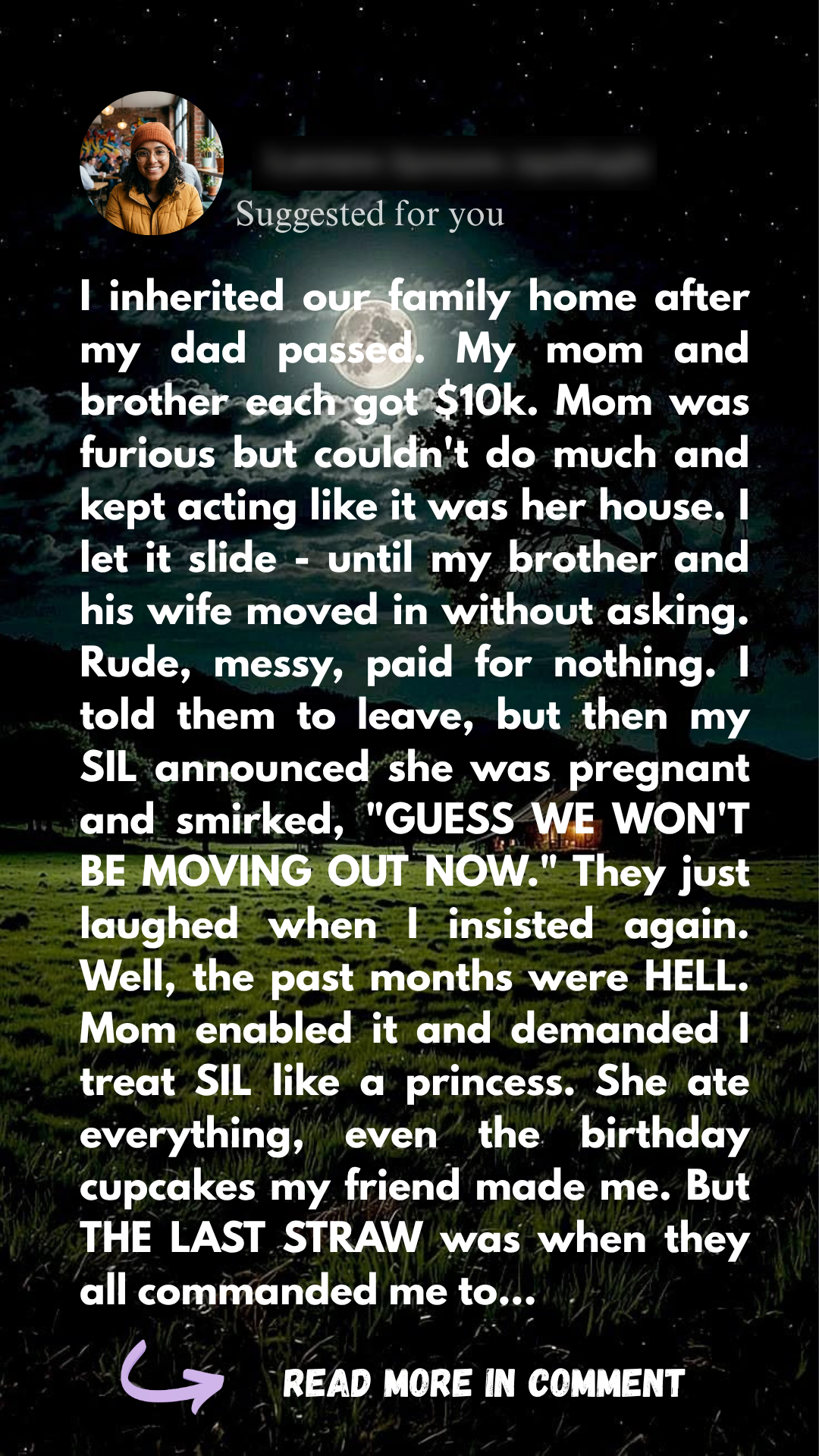 They left, frantic and outraged. I stayed with a friend while Uncle Bob finalized everything. A few weeks later, I had the keys to a cozy cottage of my own — free of entitlement, manipulation, and disrespect. When Mom texted accusing me of making them “homeless,” I simply blocked her number and moved on.
