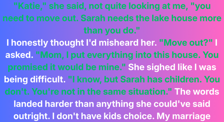“Katie,” Mom said softly, her hands folded in front of her like she was delivering bad news to a stranger. She couldn’t even look at me. “You need to move out. Sarah needs the lake house more than you do.”
