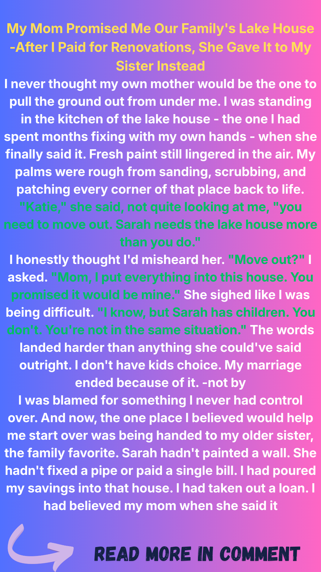 Katie’s mom PROMISED the family’s lake house would be hers one day. When she handed over the keys, Katie spent a year fixing the place, pouring her life savings into every detail. Months later, when she finally saw her dream come to life, her mom JUST RIPPED IT AWAY and gave it to her sister.