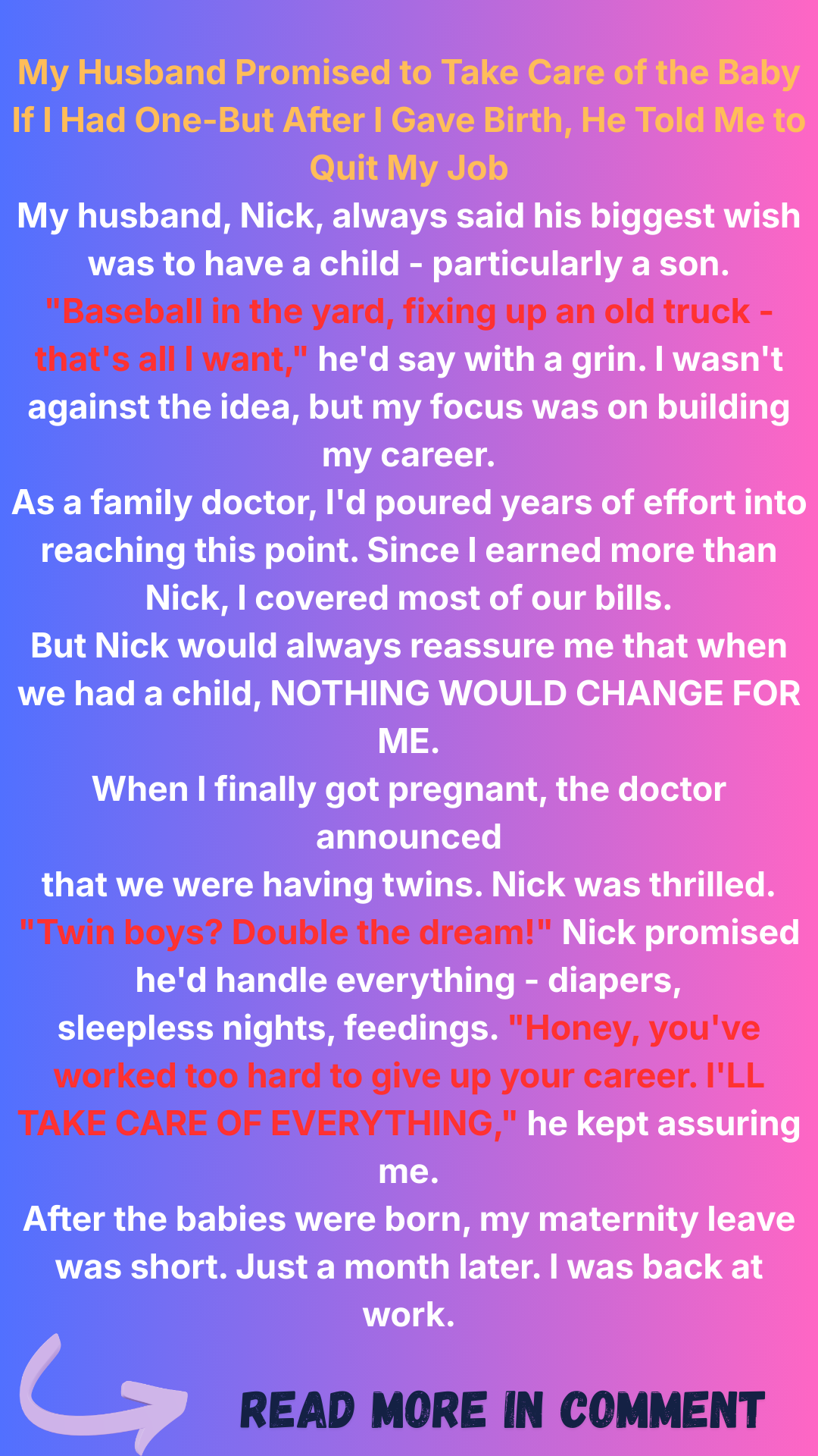 Nick, my husband, had a different dream. He wanted a son… wanted it more than anything else in the world.