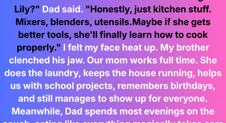 “What to get, Lily?” Dad said, laughing like he was sharing a joke. “Bro, only kitchen stuff. Mixers, blenders, utensils—you know, stuff that’ll make her actually useful in the kitchen. She’s soooo lazy in there.”