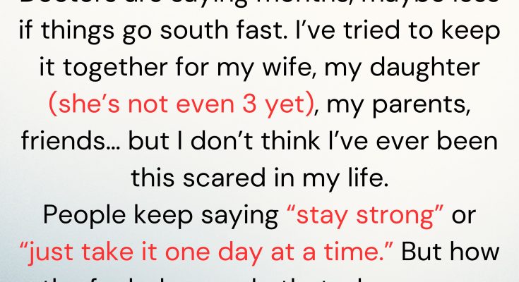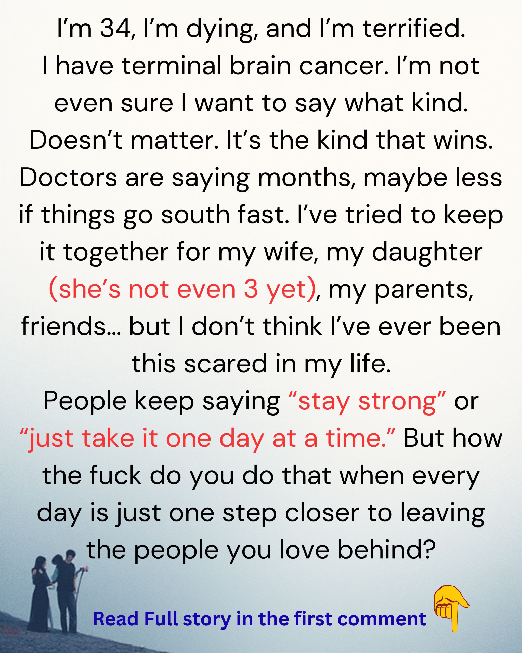 I’m 34, I’m dying, and I’m terrified. I have terminal brain cancer. I don’t even want to name the type—what matters is that it’s the kind that wins. Doctors say I have months, maybe less if things go badly. I’ve been trying to hold it together for my wife, my daughter who isn’t even three yet, my parents, and my friends, but I’ve never been this scared in my life.