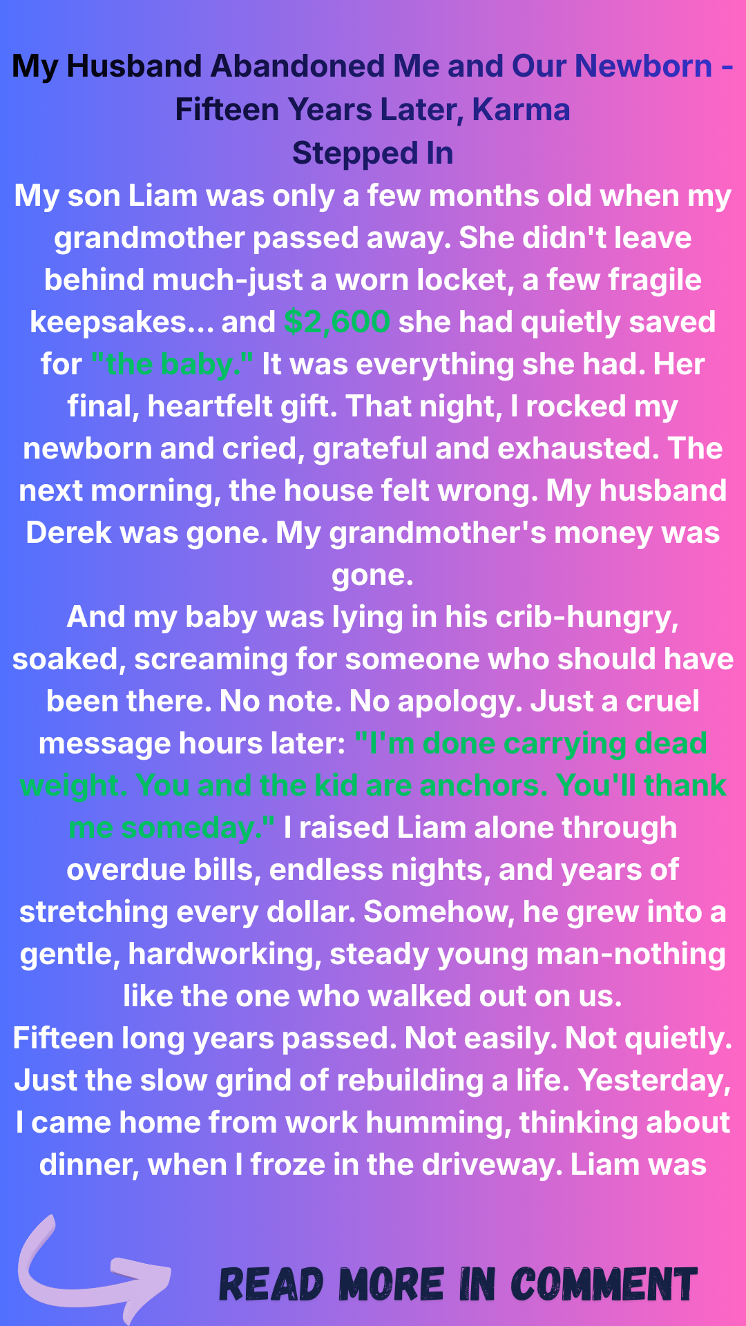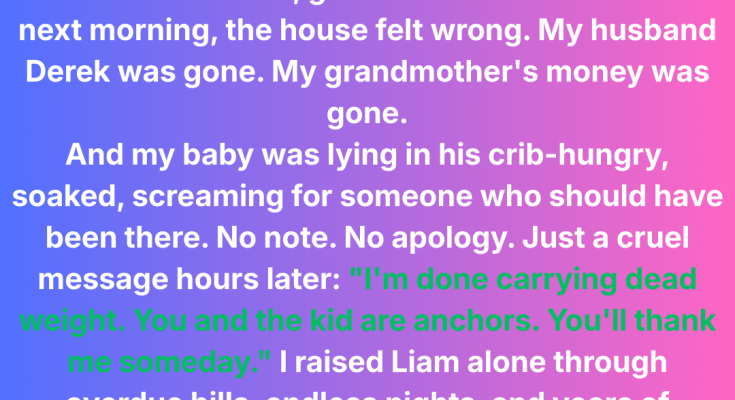 The morning after my grandmother left her last $2,600 for baby Liam, I woke to a silence that shattered everything — my husband was gone, and so was the money. Fifteen years later, the man who abandoned us returned with a threat that froze my son in place.