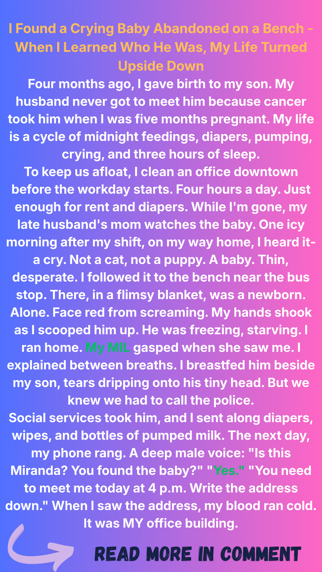 I never imagined that stopping for a crying baby on a cold morning would lead me to the top floor of the building where I scrubbed toilets for minimum wage. When I discovered whose child I’d saved, things took an unexpected turn and changed my life in ways I never saw coming.