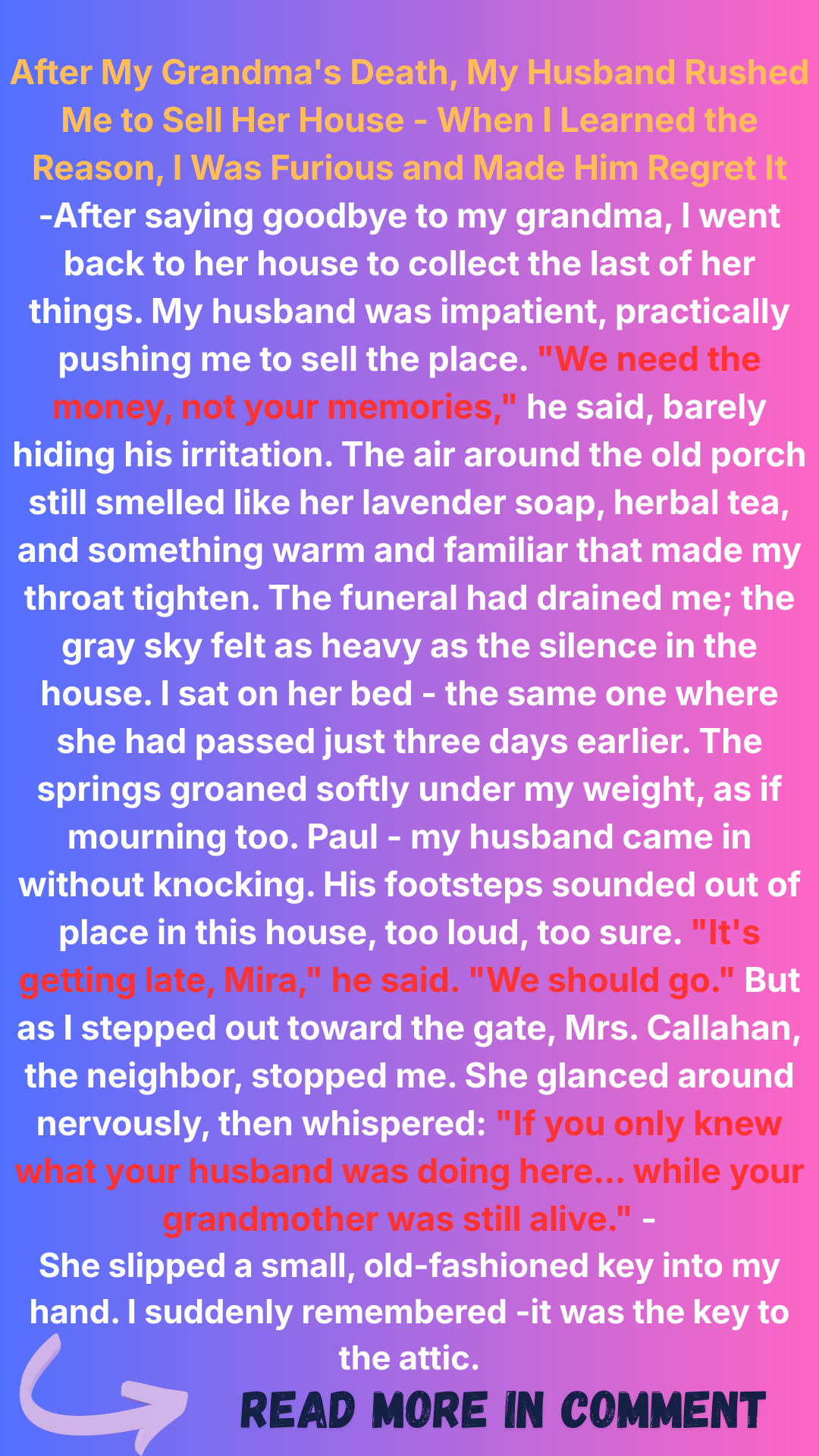 She slipped a small, old-fashioned key into my hand. I suddenly remembered — it was the key to the attic.
