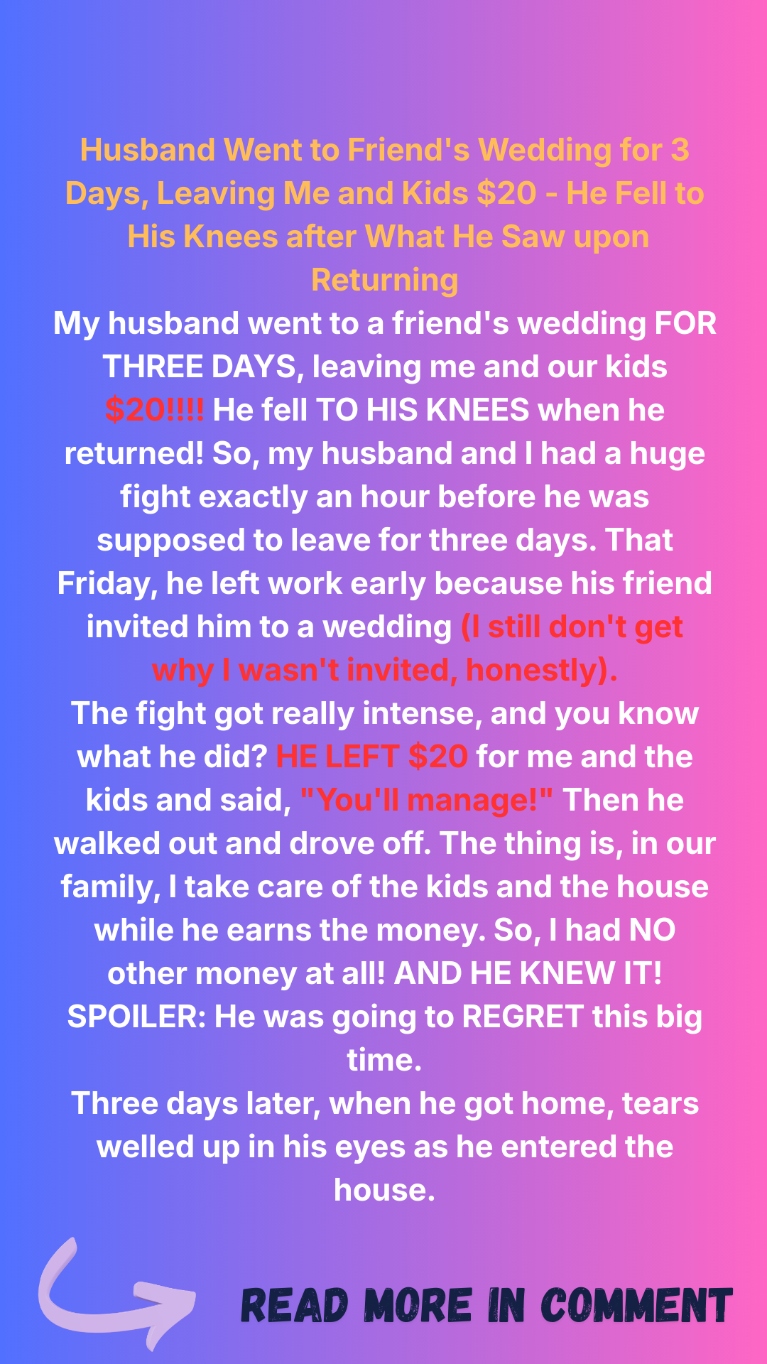 Iris’s husband left her and the kids with a meager $20 for three days while he attended a wedding alone. Frustrated and desperate, she made a bold move to teach him a lesson. When he returned, the sight before him made him fall to his knees and burst into tears.
