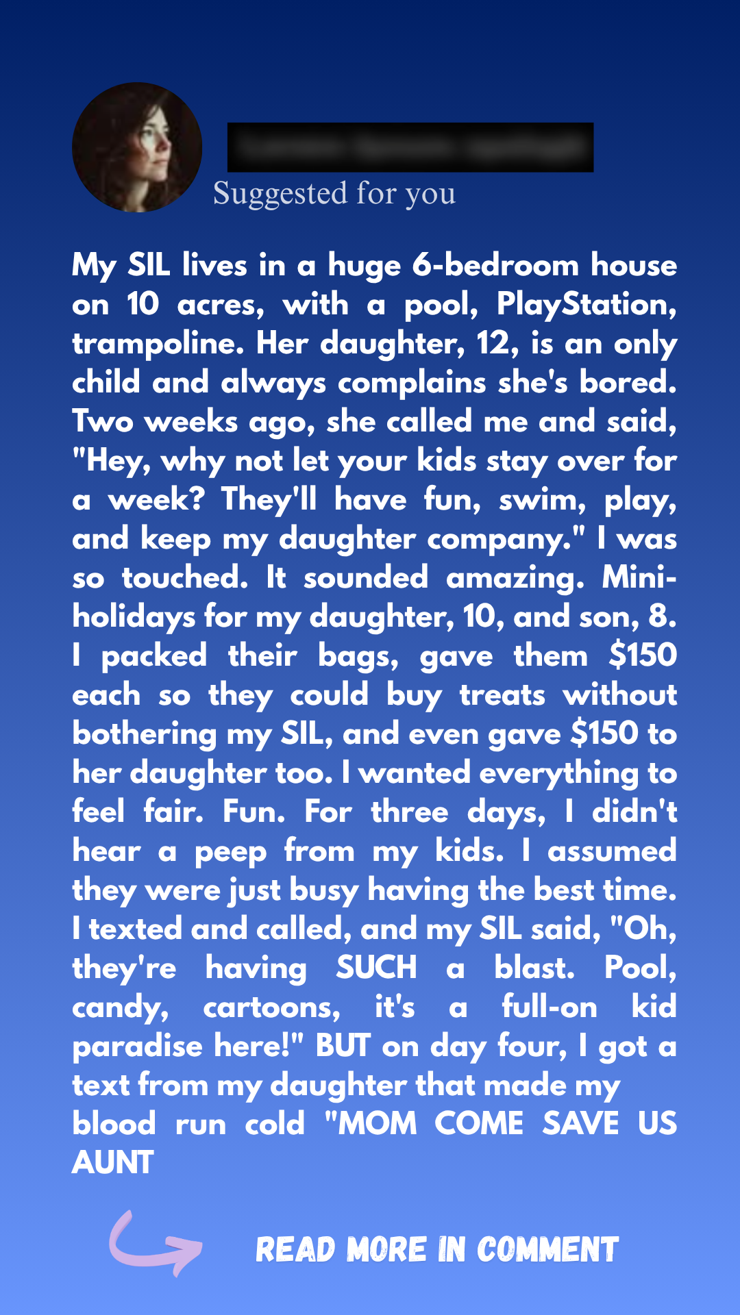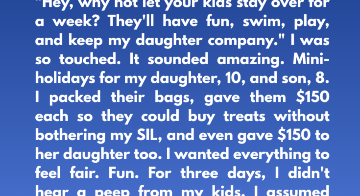When my sister-in-law invited my kids to spend a week at her massive house—with a pool, games, and endless treats—it sounded like a dream. But after days of silence and one terrifying message from my daughter, I rushed over without warning… and what I saw made my blood run cold.