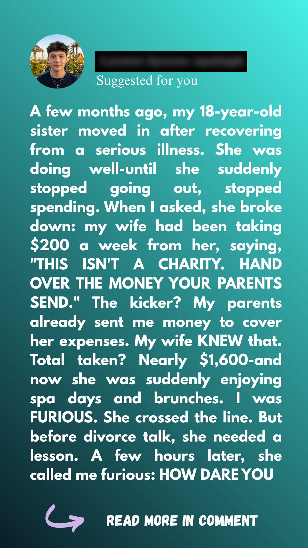 A few months ago I brought my younger sister, Ava, into our home. She was only eighteen and still recovering from a serious illness that had kept her out of school for nearly a year. At first, my wife Dana supported the idea, smiling and agreeing that it’d be good for her health and recovery to be close to her doctors.